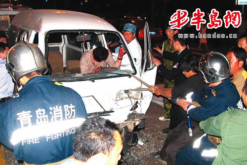 6月 3日晚 9时 30分左右,在重庆南路与长沙路路口,一辆微型面包车与一辆大货车迎面相撞,微型面包车前挡风玻璃被撞得粉碎,车头部严重变形,该车驾驶员浑身是血,被卡在车内不能动弹。