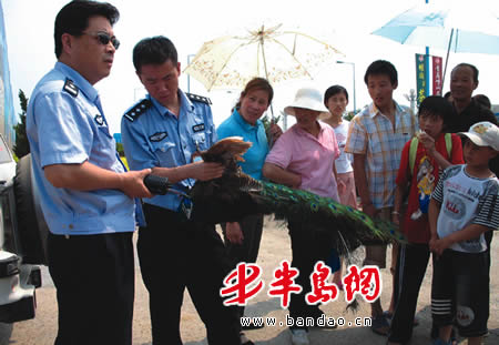 半岛网6月4日讯(实习生 黄超 记者 刘鑫)“马路上有两只大孔雀在闲逛,很多游客都在抓呢!”今天下午 2时许,市民路先生向记者反映,东海东路的草坪上出现了两只孔雀,而且附近的房顶上还有两只,十余名游客们抓了 20多分钟也没有抓住。110民警接报赶到后,与游客一起围堵,最终将4只孔雀“抓获”。