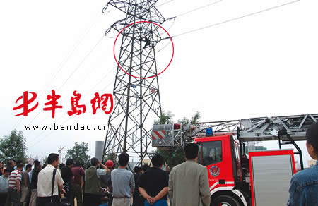 为了避免朱某从高压线塔上跳下,四方公安分局的民警和消防战士一边紧急部署营救方案,一边上前给朱某做思想工作,可朱某却一直不让营救人员靠近。