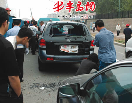 今天下午,记者闻讯赶到事发现场时看到,在山东路和鞍山路交会处附近一处施工围档边的马路上停着7辆汽车,其中有一辆奥迪轿车、一辆现代越野车。这些车辆的车体不同程度受损,其中现代越野车后车窗玻璃被砸破,车内还留有一块石头,车身下也有飞落的石块。
