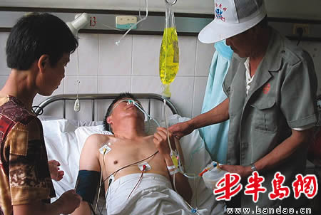 今天在即墨市人民医院急救中心,记者看到被捅伤的乘客赵某,只见他身上插着数条管子,腹部缠满绷带,腹部左下方吊着一个塑料袋,据值班护士说这是盛尿用的。据肝胆外科陈主任介绍,当时伤者的小肠有两处破裂,已经及时进行了修补,目前伤者病情稳定,没有生命危险。