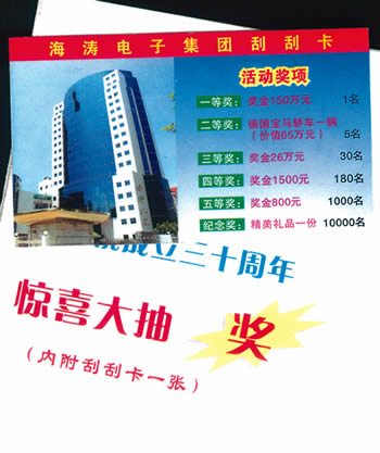 这些所谓的有奖宣传资料显示,“香港海涛集团郑州分公司”的刮奖卡中一等奖金额为150万元,二等奖金额为价值65万元的宝马车,三等奖为奖金 26万元;而“香港电子集团上海股份有限公司”的一等奖更高达250万元。其中一名读者甚至刮出150万元的大奖。而记者收集到的每一张刮奖卡都能刮出“三等奖”以上的“大奖”。
