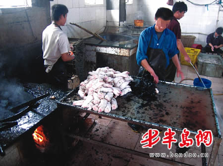 正当执法人员准备离开时,一名过路的妇女告诉记者,旁边还有一家加工生猪的场所。执法人员迅速来到与屠宰点一墙之隔的肉食加工厂,发现该加工厂虽有合法证件,却直接从隔壁的非法生猪屠宰点购进未经检疫的猪头、猪蹄等加工原料,还涉嫌使用化学品进行生猪脱毛处理,执法人员责令该加工厂立即整改,并对其违法加工行为予以经济处罚。 文/图本报记者 张伟 通讯员李坚青 王本峰