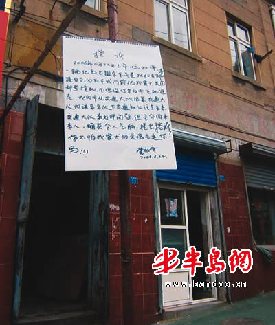 今天,记者在即墨路31号甲门口看到,路边栏杆上挂了个告示(见左图),上面写着“控诉”,内容是爱犬被一辆出租车当场撞死,司机却肇事逃逸了,控诉书言词激烈,充满了气愤和悲痛之情。