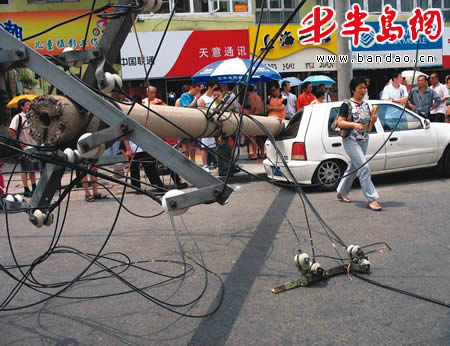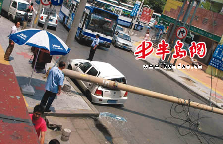 现场交警告诉记者,对于电线杆断裂的原因现在还很难下定论。目前市北交警部门正对事故原因展开调查。(请丁先生来本报领取线索费100元)