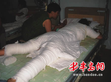 今天上午10时许,记者来到胶州市中心医院烧伤科病房时,小李正趴在床上呻吟,她告诉记者,因不能平躺,10天来她就这样趴着。小李的姥姥万老太告诉记者,她们住在北关街道办事处南庸村。6月 19日凌晨 1时许,万老太被睡在同一炕上靠窗位置的小李的惊叫声惊醒,她忙打开灯,发现小李正在炕下痛苦地跺着脚,睡衣上面全是洞,炕上的凉席和毛巾被等正冒着白烟,不一会就烧出很多窟窿。