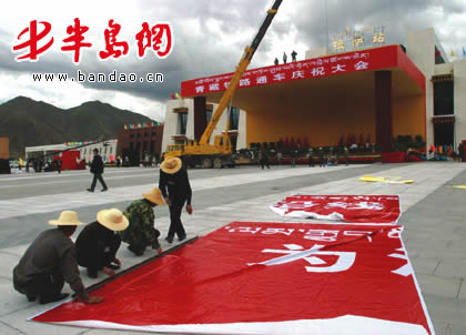 今天,拉萨火车站也装扮得格外宏伟和美丽。站前广场上,工作人员搭建起一个特大型的庆祝观礼台,“青藏铁路通车庆祝大会”醒目大字悬挂上方,周围全部用各色鲜花包围起来,与远处的布达拉宫、拉萨铁路特大桥遥相辉映,形成了一个特别的景观。