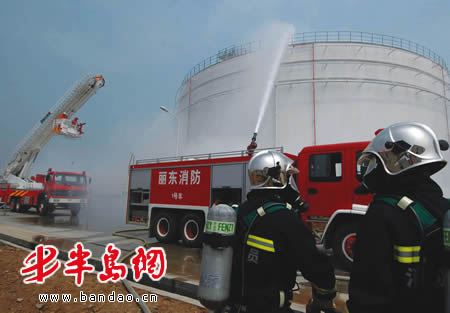 6月30日,全市最大规模的危险化学品事故应急救援演练在黄岛区重化工业区丽东化工公司拉开序幕。当天上午10时,该公司易燃易爆库区储罐“爆燃”!化工危险品原料“泄漏”!