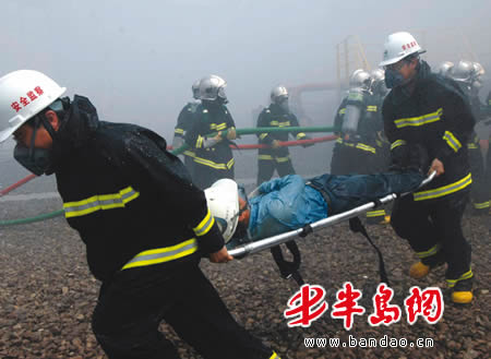 情况万分紧急!该公司迅速启动安全事故应急预案,一边组织员工疏散自救,一边报警。区政府立即启动区应急救援预案,迅速成立了由5个抢险救援行动工作组组成的黄岛区危险化学品重大事故应急救援指挥部,黄岛区安监、公安、消防、环保等部门等迅速展开救援。40多分钟后,“大火”被成功扑灭,“有毒气体”外泄也得到了全面控制,“事故”没有造成人员伤亡和更大的损失。 文/本报记者 江翡翡 图/本报记者 何毅 本报通讯员 王伟卿 俞方平