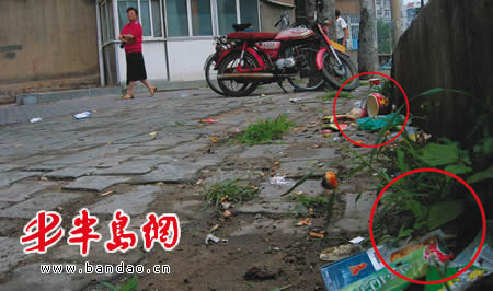 随后,记者对周边一些没有物业管理的楼座进行了调查,在嘉禾路 16号楼院内,大量的袋装生活垃圾被堆放在楼院的角落里,地上的西瓜皮随处可见,而在永乐路的9号楼、遵化路27号楼院内,也不同程度地存在着垃圾随处倾倒无人打扫的现象。