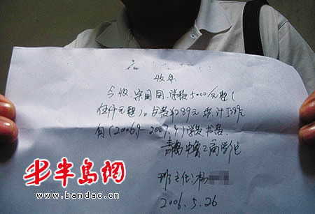半岛网7月5日讯 称学校扩建急需用钱,青岛中鲁工商学院老师杨某打白条,向部分学生收取了下学年学费书费,但杨某不久被停职,交钱学生一直没拿到学校开的收据。今天上午,记者随学生家长到该院咨询此事时,学生处张处长表示,学生家长可通过法律途径解决此事。