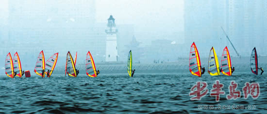 昨天上午,帆板比赛在奥帆中心前美丽的浮山湾上展开角逐。