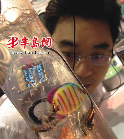 一名参观者关注一款防水的mp3 本报记者 张伟 摄