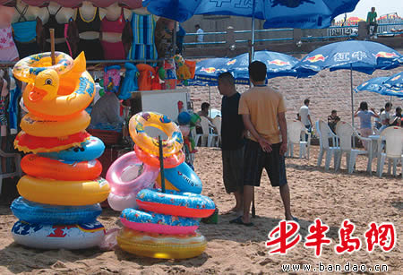 “有些浴场的小商贩出售的游泳圈竟然是劣质货或是三无产品。”今天上午,市民曹女士向记者反映了此类问题。