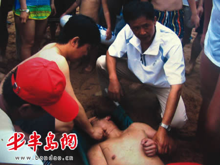 “有名男子突然晕倒了!”今天中午 12时20分许,第六海水浴场韩场长巡视到海边时,发现离岸边五六米远的地方一名长发男子扶着另一名男子,朝岸边大声喊叫,韩场长穿着衣服跑了过去。长发男子告诉韩场长,他姓张,刚才在海中游泳时,身边的一名男子突然口吐白沫,四肢抽搐,晃悠了几下就晕倒在海水中,张先生见状慌忙扶起了他。