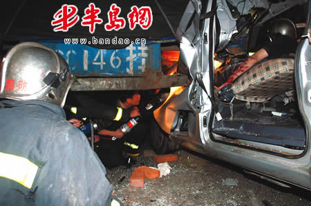 记者闻讯赶到事发现场时,营救人员正在紧张救援。记者看到,面包车紧紧地“咬”住货车的“屁股”,车头部位已经被撞烂,卡在了货车的底部,地上到处是破碎的玻璃,司机夹在车里面,身上全是血迹。