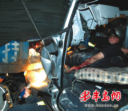 记者看到,面包车司机的胳膊上和腿上全是血迹,很快就被抬到停靠在旁边的120救护车上,医生马上对其实施紧急救护。据当时出诊的大夫说,由于卡在车里的时间过长,伤员的双腿麻木,身上多处被碎玻璃划伤,但并无大碍。随后,伤员被送往市立医院救治。