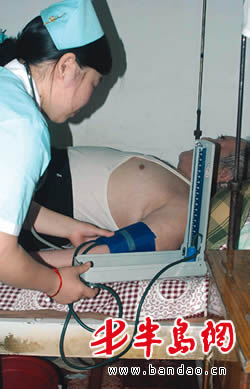7月14日,长征医院的医护人员在给双目失明、患有脑血栓后遗症的孤寡老人蒋大爷测量血压。由于各项条件都符合要求,长征医院将向市医保部门提出申请,为蒋大爷设立社区家庭病床。 本报记者 王滨 摄