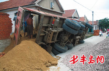 7月16日中午,一辆载满沙子的工程车从即墨市蓝村镇大官庄村经过时,因轧塌路边的水沟盖板而侧翻。随后,工程车撞倒路边居民潘先生家的屋墙,正在家里吃饭的潘先生和14岁的女儿被埋在废墟下,百余人联手将他和女儿救了出来。经医院抢救,潘先生和女儿已经脱离危险。目前此事正在进一步处理中。