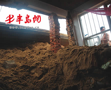随后,记者来到事发现场,见潘先生家的东屋墙已荡然无存,只有两根刚用砖垒起的“简易柱子”顶着房顶。潘先生家的前墙和明间墙壁裂开很宽的口子,明间里只有3根木头,支撑着摇摇欲坠的墙壁。工程车还侧翻在屋外,几名男子正在清理车斗里残留的沙子。