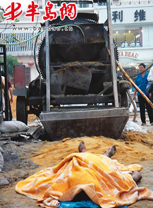 半岛网7月19日讯(记者 刘鑫 刘红) 今天下午4时10分许,南京路与闽江路交界的一工地上,一工人站在铁架上清理搅拌机上的泥沙时,搅拌机的翻斗突然上升将工人挤在搅拌机的翻斗与铁架中间,119、120迅速赶到现场抢救,抢救人员用了近20分钟时间终于将其救下,但该工人已经死亡。