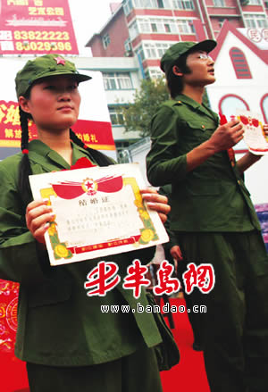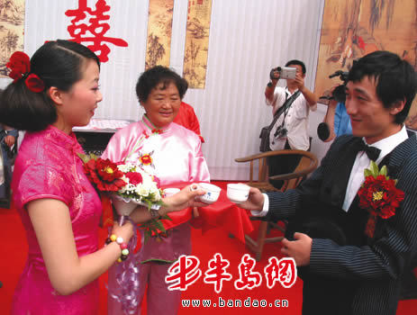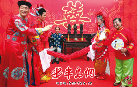 记者在现场看到,四场婚礼细致地展现了百余年来我国婚俗文化的演变过程。除了晚清新人的踢花轿、跨炭火和拜天地之外,民国新人吃和顺榄、敬百合茶,上世纪70年代新人背毛主席语录、互赠红宝书等各种婚礼程序都富有浓重的时代特色。“50年代一张床,60年代一包糖,70年代红宝书,80年代三转一响……可以说婚礼仪式和其他文化现象一样能展现社会历史的变迁。”市北区政府特色街管委会的工作人员告诉记者,举办这场“时空婚礼”是要为整合延安二路婚纱街商业资源做准备。据悉,延安二路婚纱街将成为提供婚庆咨询、婚房装修、婚庆服务等一条龙服务在内的“结婚一条街”。 文/本报记者 高一靖 图/本报记者 何毅