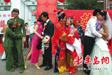 7月21日上午,一场再现晚清、民国、上世纪70年代和时下四个不同时期的集体婚礼在市北当代广场隆重举行,各个时期婚礼的时代特色,让到场来宾和前来观看的近千名市民大开眼界,笑声不断。