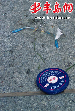 记者在现场看到,地上的血迹足有十余米长,血迹里还夹杂着大大小小玻璃碴子,地上躺着一个标有“香港橄榄菜”字样的铁制罐头瓶盖。记者注意到,与盖子一起的还有一副破碎的眼镜。“眼镜是伤者被砸丢的!罐头则是从天上掉下来的。”一位居民告诉记者。