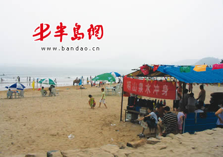 今天下午3时,记者来到崂山风景区售票站(沙子口)东侧 100米处的海边看到,沙滩上搭建了两个简易的防雨棚(图一),作为出租泳圈、销售泳衣的小卖部,小卖部后面则是一个用钢板搭建起来的冲澡间,顶上挂着几个蓝色的汽油桶。不少游客来到这里,饶有兴趣地从小卖部买了泳衣、租了泳圈,就下海游泳。