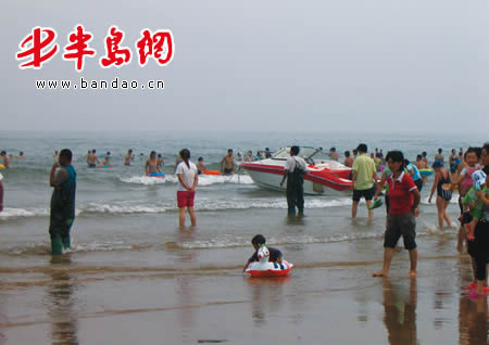 记者发现,现场没有一个专业的救护人员,而由于缺少专门人员管理,有摩托艇竟然开到了海中游泳者的中间(图二)。