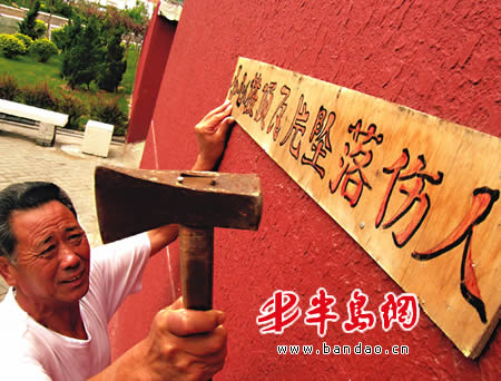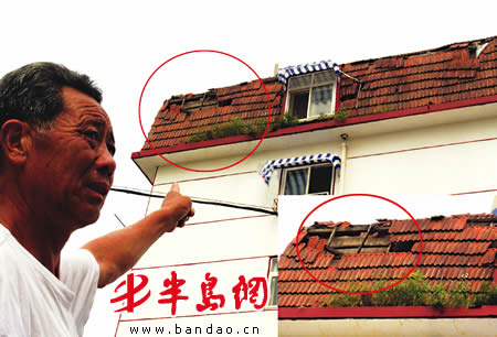 记者赶到了夏庄路 140号时,65岁的孙大爷正在往墙上钉自制的警示牌,上面写着“小心楼顶瓦片坠落伤人”(图二)。孙大爷说,这里的7栋楼都是上世纪90年代建的,是当地第一批“红屋顶”的房屋,住了200多户居民。可是,随着年久失修及风吹雨打,从 2003年起,7栋楼就开始不停地往下掉瓦片,如今掉得更厉害了,几乎每天都有瓦片坠落,前几天,他出门去买菜,结果4块碎瓦从天而降,突然在眼前“炸开”,那情景现在想起来都让人后怕。孙大爷还说,已经有好几位居民被掉下的瓦片砸伤,居民们无奈地称这 7栋楼是“掉头皮楼”。