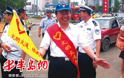 启动仪式后,市领导带头当文明交通志愿者,分4路走上街头纠正不文明行路行为。上午10时许,戴着小红帽、身批红绸带、手持文明旗的市委副书记蔡伦斌、市公安局局长王永利等6名志愿者,来到了香港中路与徐州路路口当了一回志愿协管员。“市委领导要带头倡导城市交通文明”,蔡伦斌一边举旗劝导行人不要违法横穿马路,一边和其他几位领导交流。在台东一路和威海路路口,市委常委、宣传部长王伟等领导,向行人发放了印有交通法规的扇子、交通卡。