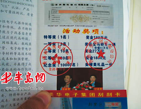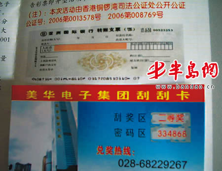 记者随后拨通了刮奖卡上的兑奖热线,电话里,一名自称姓方的小姐先要记者告诉她刮奖卡的号码以及中奖人姓名。随后,这名方小姐对记者说:“祝贺你幸运中了二等奖,奖金为27万元,青岛地区仅此一人。”要记者抓紧时间到成都领奖,在领奖前,要按照中奖金额的1%,往指定账户上支付中奖公证费2700元。但仅菏泽三路8号楼就有10余户中了二等大奖,哪来的“仅此一人!”