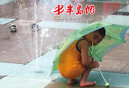 7月30日,在五四广场,一顽皮男童撑起伞靠着喷泉纳凉。