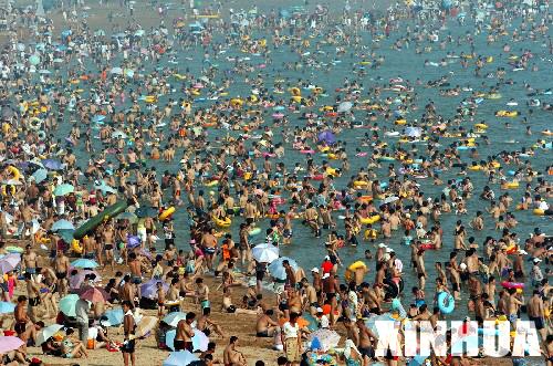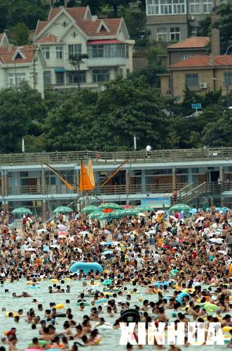 青岛第一海水浴场人满为患。
