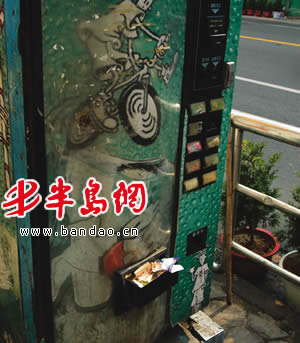 记者今天在中山路两侧看到,相当一部分自动售货机已经被破坏。有的只剩下外壳,里面没有任何商品;有的投币口位置显示红色指示灯;有的投币口被贴上了小广告。记者从中山路南端一直走到中山路北端,发现两侧的40多台自动售货机只剩 10台左右还能正常工作。天津戈德移动商务有限公司青岛分公司的楼经理告诉记者,这些不能工作的售货机近期要送往天津总公司进行大修,新机器近期将到位。
