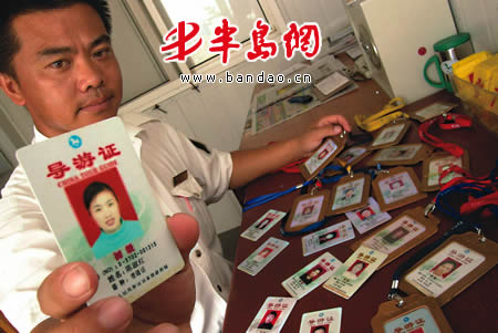 今天上午10时20分,一辆挂河北牌照的旅游大客车驶入流清售票口,一名胸前悬挂导游证的女子来到售票窗口购票。执法人员要求其出示导游证时,该女子竟从脖子上摘下导游证装进裤子口袋,“我没有导游证,是青岛某旅行社委托我带团的!”说着便丢下30多名游客向停车场外跑去,景区城管队员追出 50多米后,将该女子截住。