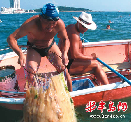 由于近日来本市各大浴场频繁出现海蜇伤人的事,经常在第一海水浴场洗海澡的20多名市民决定主动出击,于是自发组织了一支义务捕捞海蜇队。8月9日下午,记者有幸跟随这些志愿者出海执行了一次捕捞海蜇的任务。