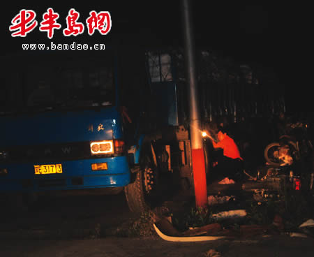 8月10日晚9时许,记者驱车赶到位于莱西市望城街道办事处栖霞路的事发现场时,民警和交警已在保护现场。记者看到,在马路的东侧,用红布盖着一具尸体,红布外散落着一些碎肉,几辆警车闪着警灯停在尸体旁边。