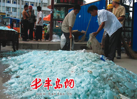 今天上午10时50分许,记者闻讯赶到事发现场时看到,一大堆碎玻璃堆在路边,一些碎玻璃上还沾着血迹,几名工人正在现场清理,碎玻璃渣子装了好几袋子。工人孙先生告诉记者,4名受伤的搬运工已被送到市立医院东院区治疗。