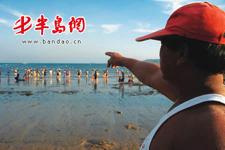 今天下午5时30分,记者闻讯赶到事发现场时,那名遇险游客已被救上岸。第六海水浴场救护队的庄队长告诉记者,下午5时15分,他正在巡逻,突然听到一名正在洗海澡的男子大声呼叫:“快看,有个男子在防鲨网上睡着了!”他急忙顺着男子手指的方向望去,果然发现在距离海边200多米远的防鲨网上,一名男子头朝下漂浮在水面上。