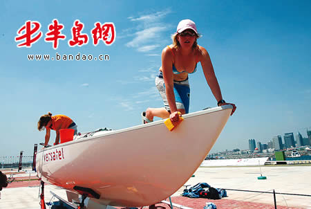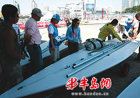 作为东道主,中国队两个月前就来到了青岛,运动员的注册和船只的拼装早已完成,因此从上午就看到好多中国队的帆船在基地的港湾试航,因为中国队同其他队一样,只是在18日才被允许进入帆船基地内进行试航和训练。此外,一些手脚麻利、行动比较早的欧美选手,像法国、挪威、奥地利等队的选手,也都抓紧时间在港湾内下水进行了适应赛场环境的训练。