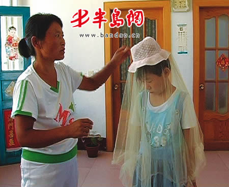 一见12岁的笑笑,记者愣住了,她的头上罩着蚊帐,显得相当奇怪。高莲正告诉记者,这是她被逼无奈自己想出来的法子,平时孩子可以穿着长衣长裤防止胳膊和腿被蚊子叮,而裸露在外的面部就成了蚊子重点“攻击”的对象。高莲正就找出笑笑平时戴的帽子,将蚊帐缝在帽沿上,这样垂下来的蚊帐正好将孩子包得严严实实。