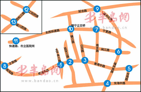 这13处事故快速处置点具体位置位于: 1.香港西路与太平角六路路口,主要管辖太平角四路以东至延安三路以西路段;2.香港西路与延安三路路口,主要管辖延安三路以东、江西路以南、山东路以西路段;3.香港中路与山东路路口,管辖山东路以东、江西路以南、南京路以西;4.东海路与福州南路路口,管辖南京路以东、香港中路以南、燕儿岛路以西路段;5.香港中路与台湾路路口,管辖燕儿岛路以东、江西路以南、麦岛路以东路段; 6.福州南路与闽江路路口,管辖福州南路以东、宁夏路以南、香港中路以北、燕儿岛路以西路段;7.南京路与宁夏路路口,管辖山东路以东、江西路以北、福州南路以西、宁夏路以南路段;8.南海路与文登路路口,管辖香港西路、太平角四路以西区域;9.福州北路与延吉路路口;10.镇宁立交桥上;11.快速路,市立医院岗;12.辽阳西路与劲松三路路口;13.银川西路与劲松三路路口。