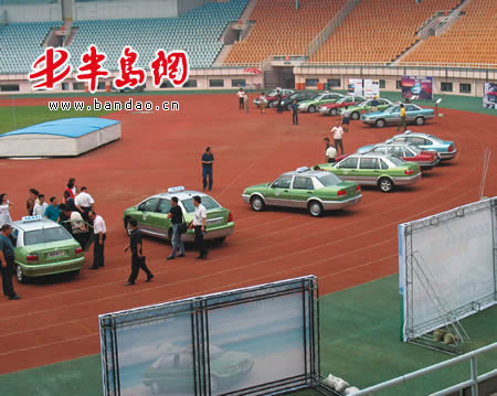 举行完招标开标仪式后,部分出租车公司经理、司机到天泰体育场观看了11款车型的样车(如图)。
