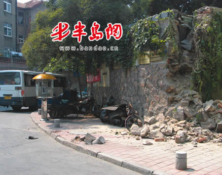 今天下午1时许,记者接到市民反映赶到现场时看到,旅游大巴撞在了齐东路14号的院墙上,尾部凹进去了一部分,墙体的一角已经被撞塌,碎石散落了一地,江苏路派出所的民警正在事故现场调查处理。