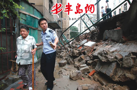 8月25日凌晨,民警在护送一位老大妈走过坍塌的护坡墙。“俺真惊了!半夜睡梦中听到一声巨响,声音比下雨打雷声还大,我还以为是‘天塌了’呢!”岛城突然降下的一场雷阵雨,使瑞昌路45号楼旁的一堵约一层楼高的护坡墙轰然倒塌,吓得二层楼上的张大爷一身冷汗。由于大雨来得急,杭州路上30家网点房被淹。 本报记者 刘延珉 摄
