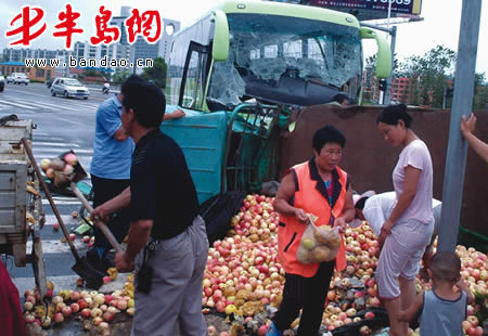 今天上午9时许,记者闻讯后赶到事发现场,一辆从开发区安子码头发往胶南的大客车停在路边,大客车前风挡玻璃被撞碎,车头前部严重扭曲变形。在距其两米远的地方,一辆农用三轮车斜倒在路边绿化带上,车上满载的上千公斤苹果散落在路边。目击者薛先生告诉记者,当时看到拉苹果的三轮车要右转,但不知道为什么大客车并没有减速避让,结果两车撞在了一起。