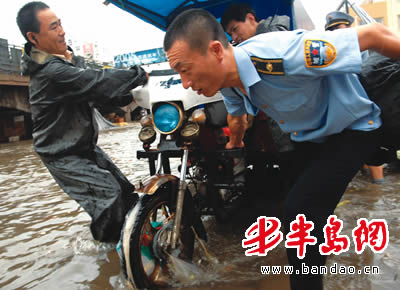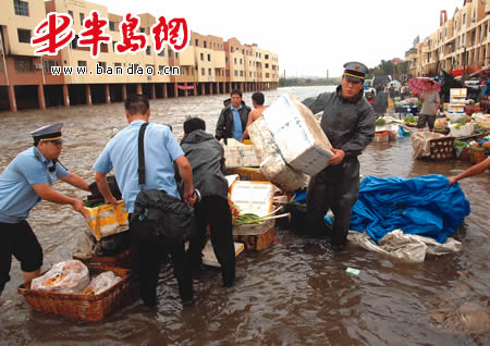 “大家快动手,帮河底业户转移货物!”随着李沧城管王副局长的一声令下,50多名城管队员迅速行动,两个小时后, 500多个摊位的货物就被转移到安全地段。此时,李村河底市场的大水已经漫过了膝盖,最深的地方可达到腰。