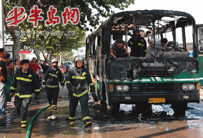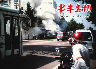 9月2日下午2时许,本报新闻热线 82828250接到许多读者反映:在308国道下王埠路段有一辆109路公交车燃起了大火,车内的许多乘客纷纷跳窗逃生。